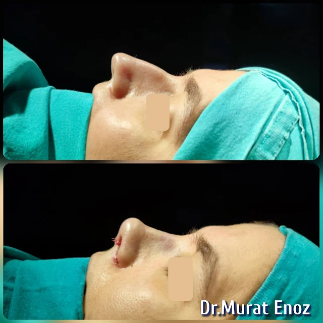 In thick-skinned noses, the nose may appear slightly upturned immediately after the operation, due to skin edema at the tip of the nose and downward orientation at the tip of the nose in the first few months. As a very good example of this, Comparison of 1st and 5th Months After Nose Aesthetic Operation link. The nose of the patient shared in this link may look like an upturned and short nose just after the surgery, but in the image after 5 months, it can be noticed that the supratip area is edematous and the nose looks more natural. You need to have some patience.