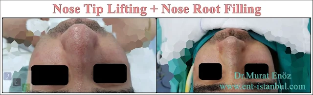 Filling the nasal root with the subcutaneous tissue of the patient provided a natural camouflage of the nasal arch. Again, directing the tip of the nose forward and upward provides camouflage of the nasal arch; It enabled the nasal valve angle to increase, the treatment of sagging at the tip of the nose while laughing and the removal of the bored nasal tip when viewed from the front.